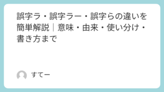 知識 誤字ラ・誤字ラー・誤字らの違いを簡単解説|意味・由来・使い分け・書き方まで インターネットで文章を書いていると、「誤字ラ」「誤字ラー」「誤字ら」という言い方を見かけることがありますよね。なんとなく意味はわかるけれど、違いまでは説明できないという方も多いのではないでしょうか。この記事では、それぞれの言葉の違いや使い分... 知識