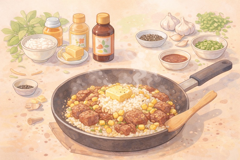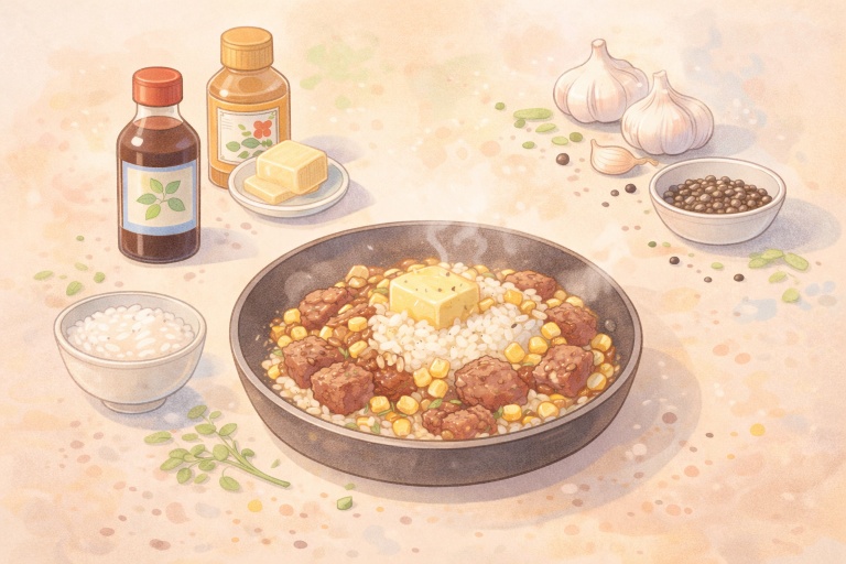 しょうゆベースのコクに、バターのまろやかさが重なることで、あの味の土台ができます。