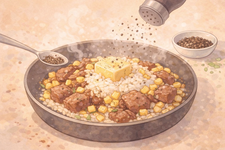 バターのコクと黒コショウの香りが加わることで、一気にお店らしい雰囲気になります。