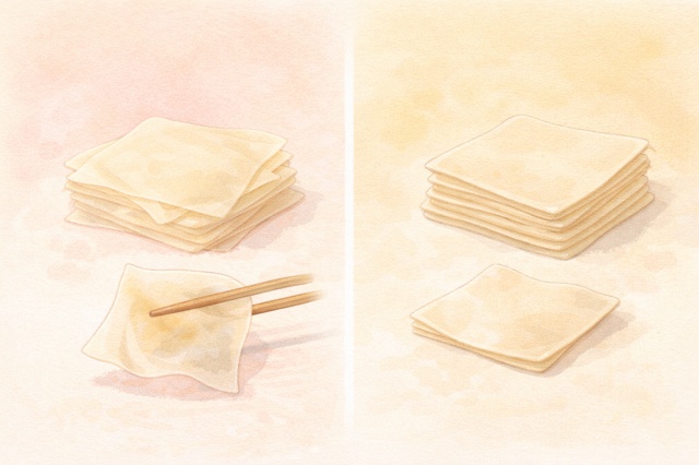 特に具なしワンタンやスープワンタンのように軽い料理では、どちらの皮でも美味しく仕上がります。
