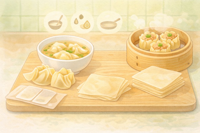 例えば、スープの軽やかさを出したい日はワンタンの皮、食べ応えを重視したい日はシュウマイの皮など、目的に合わせて選ぶことで味わいがより豊かになります。