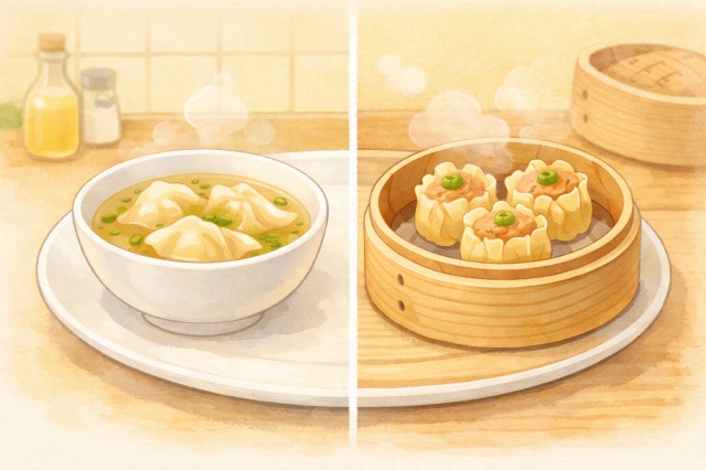 ワンタンの皮は蒸すともろくなりやすく、シュウマイの皮はゆで料理で硬さが残る可能性があります。