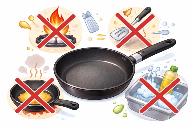 最も注意すべきは空焚き・強火・金属ヘラの使用です。