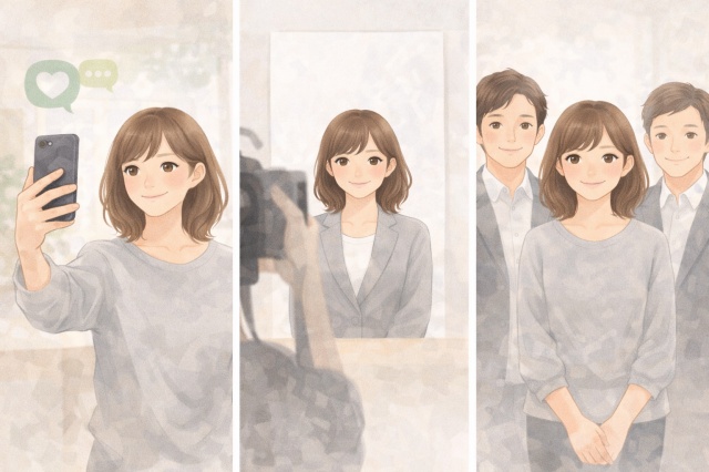 服の色、首元デザイン、光の向きを意識するだけで大きく印象が変わります。