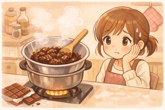 チョコがぼそぼそになる主な原因 湯煎の温度が高すぎる/水分混入/混ぜすぎ