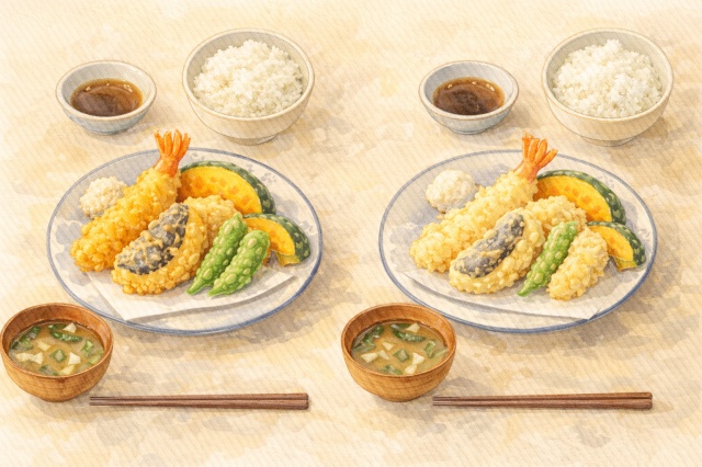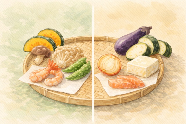 野菜天ぷらなどは、卵なしのほうが軽く感じられることもあります。