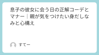 生活 息子の彼女に会う日の正解コーデとマナー|親が気をつけたい身だしなみと心構え 息子の彼女に初めて会う日は、なんとなくそわそわしてしまうものですよね。どんな服を着れば良いのか、どんなふるまいを心がければ良いのか、迷うのはとても自然なことです。相手に好印象を持ってもらいたい気持ちは大切ですが、肩に力を入れすぎなくても大丈... 生活